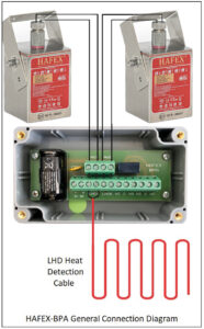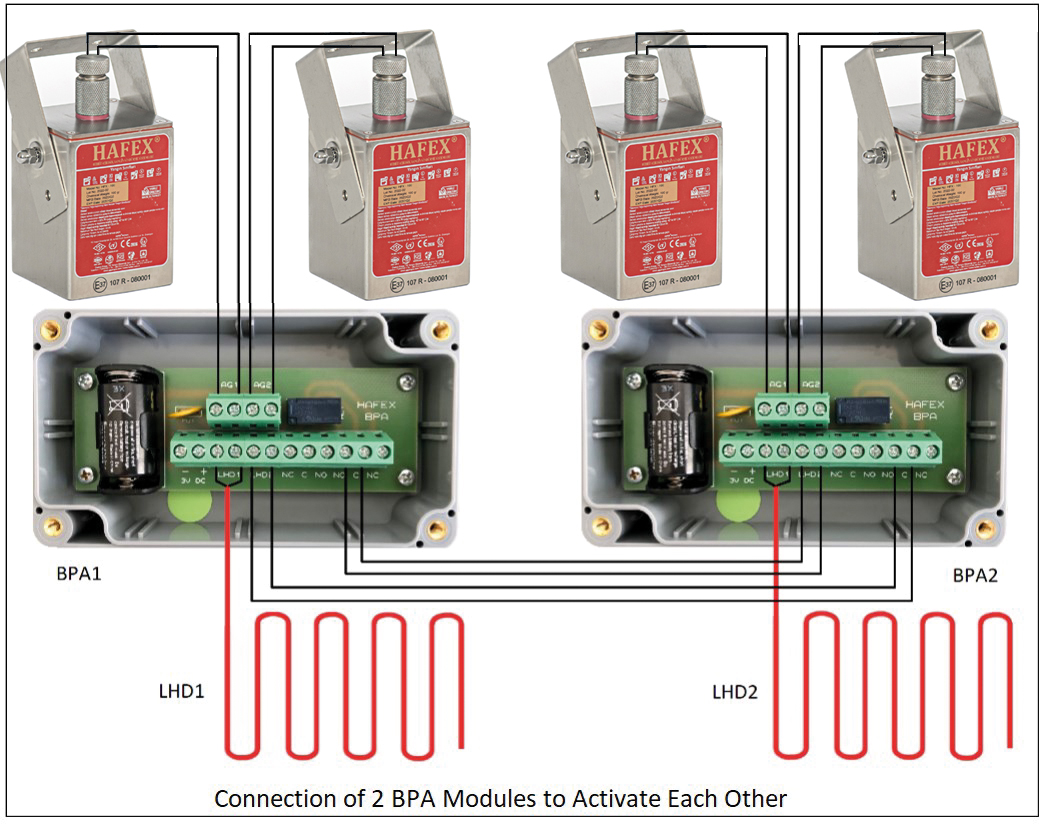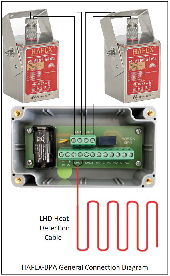 HAFEX – BPA modülü, 2 aerosol yangın söndürücü ünitesini etkinleştirmek için tasarlanmıştır. Aerosol söndürme üniteleri AG1 ve AG2 bağlantı portlarına bağlanır. Yalnızca bir aerosol söndürme ünitesi bağlanacaksa, AG1 veya AG2 portlarından yalnızca biri kullanılır. Bu durumda, diğer bağlantı portu boş bırakılır. BPA modülünün LHD1 veya LHD2 girişlerinden herhangi biri, LHD ısı algılama kablosu bağlantısı için kullanılabilir. BPA modülüne bağlamadan önce LHD ısı algılama kablosunda hasar ve kısa devre olup olmadığını kontrol etmeniz önerilir.