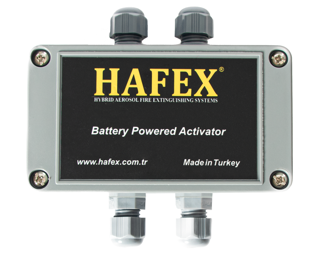 HAFEX – BPA (Batarya ile Çalışan Aktivatör), 2V kapasiteli dahili bir lityum CR3 bataryaya sahiptir, 800mAh kapasiteli, küçük hacimlerde Doğrusal Isı Algılama kablosu (LHD) ile ortam sıcaklığını algılayabilen ve ortam sıcaklığı LHD kablosunun alarm eşiğini aştığında 2 aerosol yangın söndürücüyü etkinleştirebilen küçük boyutlu bir modüldür.İstenirse 3V DC 2A güç kaynağı ile harici olarak beslenerek dahili batarya yerine kullanılabilir.